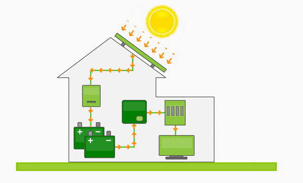 Durante el dia los paneles le produciran energia para recargar las pilas y abastecer las necesidades del lugar, el exceso se le vende a la compania y durante la noche en lugar de usar energia de la compania utilizariamos la energia acumulada en las baterias y este ciclo se repite.